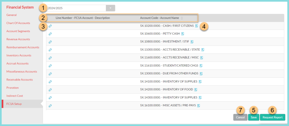 Click the Pencil. A drop-down menu will appear. Click the appropriate FC1A Line Number to assign it to the Account Code.