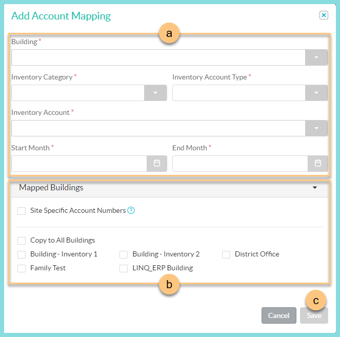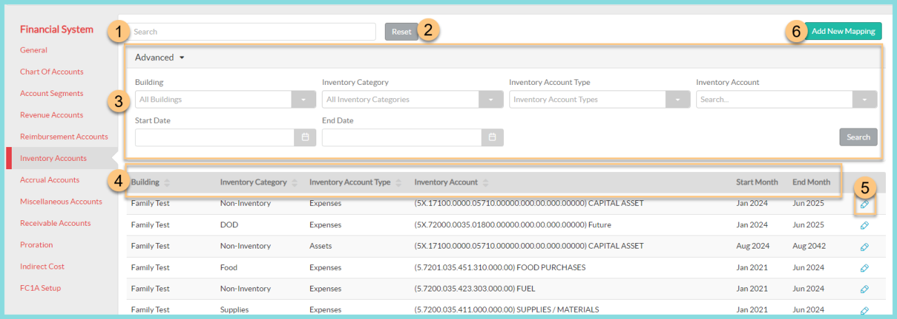 Filter mapped Inventory Accounts by Building, Inventory Category, Inventory Account Type, Inventory Account code, Start and/ or End Date by using the corresponding drop-down menu.