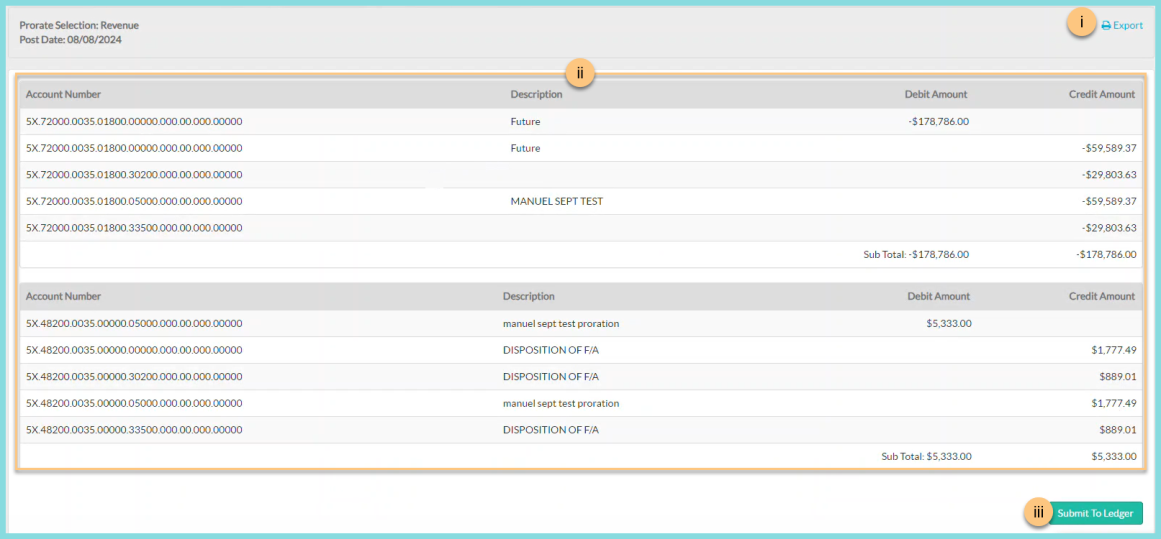 3. Click Submit to Ledger to post the prorate report for the period to the general ledger.
