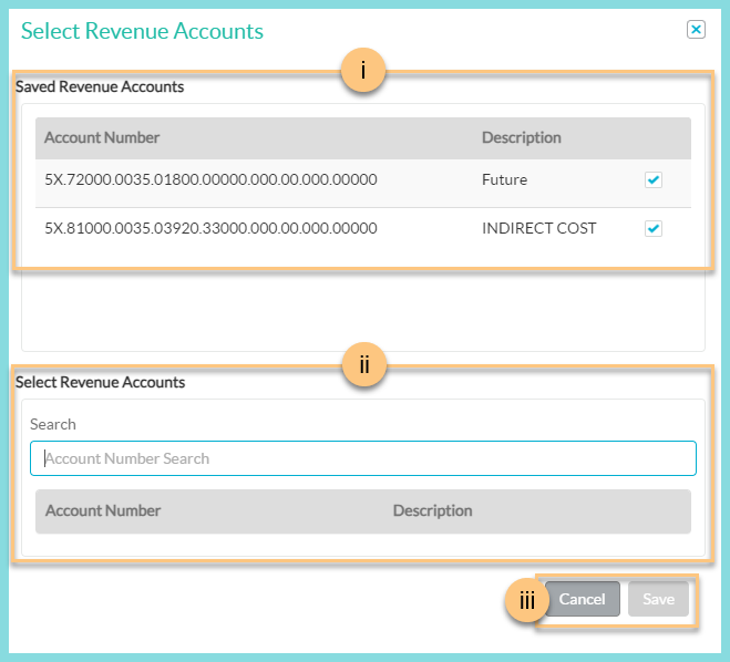 3. Click Save to save your selected accounts as revenue accounts. Click Cancel to close the modal.