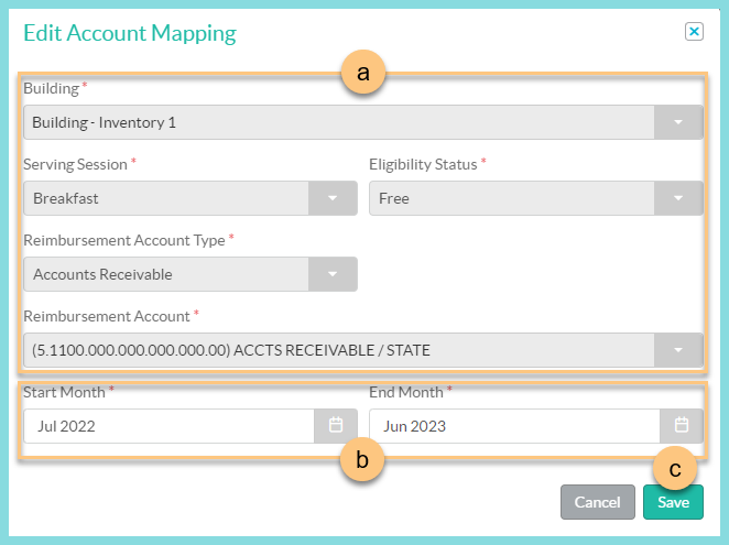 After accounts have been imported, a Reimbursement Account mapping should be made for every combination of Serving Session, Eligibility Status, and Building.