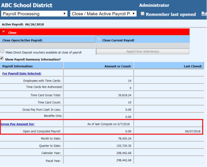 Complete and Close June Payrolls. Complete your last June 2018 payroll. After the payroll has been completed make sure to close the payroll. Select “Payroll Processing” and then select “Close / Make Active Payroll Permanent”. This screen will show the last payroll that was closed.