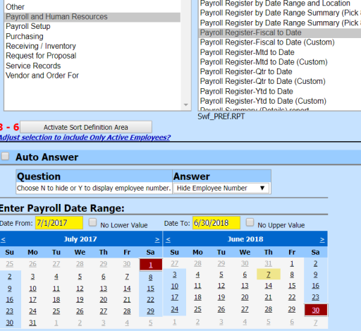 Run Fiscal year end reports. After running the last payroll for the fiscal year, the next step would be to run various payroll reports to check the accuracy of your data. Some of the reports that can be used to check the data are shown below, with a screen print of each. The first two reports are located under the menu option “Reports” and then “General Accounting Reports.” The report group is “Payroll and Human Resources.”
