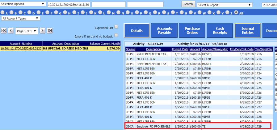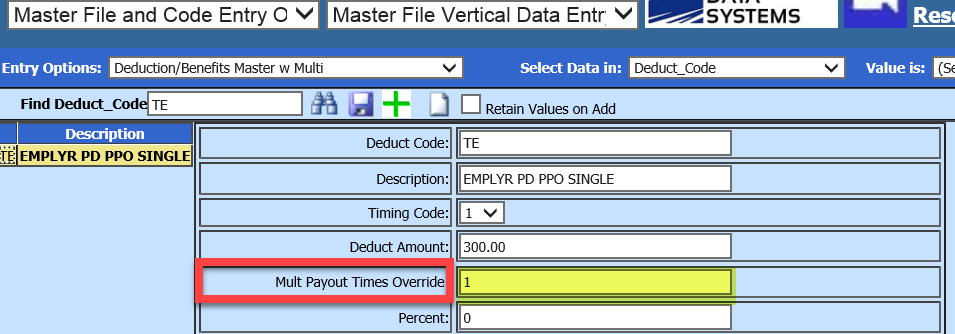 For this example, I have changed the code “TE” “Emplyr PD PPO single” to a 1. We will be able to follow this code through the payroll accrual process.