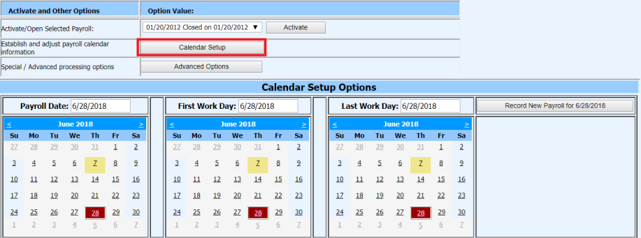 Add a June Payroll Date for the Accrual Payroll. To continue with the Payroll Accrual Process, add a new June payroll date. Under the menu option of “Payroll Processing”, select “Activate/ Open a Payroll.” Then select the “Calendar Setup” button. Select a June date for this payroll. It does not have to be June 30th. Then select to “Record New Payroll for 6/xx/2018.