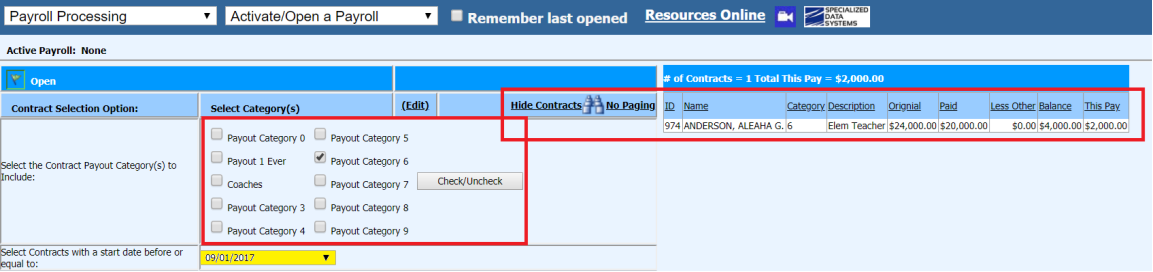 Select the desired payout categories that you need for this payroll. For this example, I am using just the payout category of “6”. For the date that is next to “Select Contract with a start date before or equal to” use the most recent date of your contracts starting date. Select the option to “Show Contracts.” A list of the contracts in payout category 6 will view on your screen.