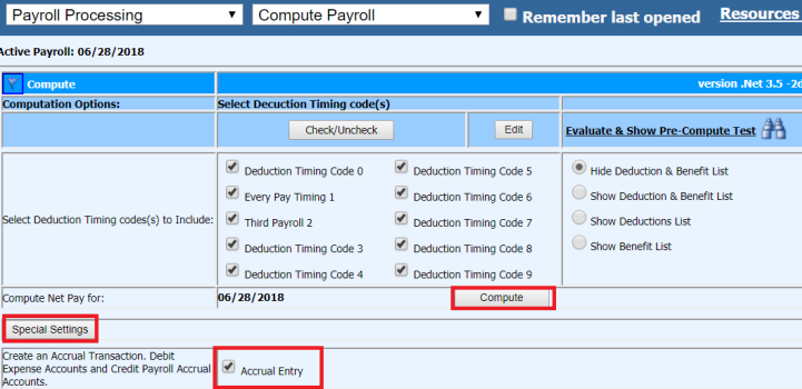 Select “Accrual Entry” under “Special Settings” in “Compute Payroll”. Select the option of “Accrual Entry” after opening the “Special Settings.” After this option has been selected, you need to select the “Compute” button. Once the system is finished computing the payroll, the “Payroll Register (Detail) report will populate.