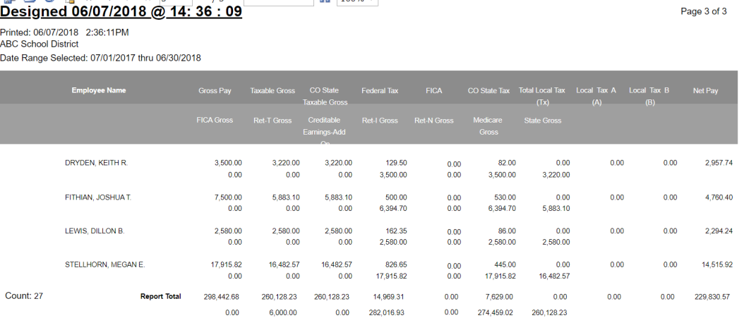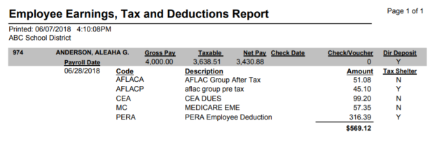 Screen 2: Payroll Employee Earnings, Tax and Deductions: This report will show the deductions for the payroll for each employee.