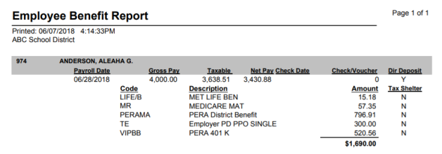 Screen 3: Payroll Employee Benefit Report: This report will show the benefits for the payroll for each employee.