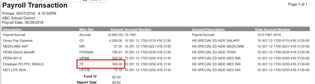 Screen 4: Payroll Transaction Report: Notice that the TE code which was setup for $300 per pay, it was only taken one time as per the setup in the “Multi Payout Times Override. The Multi Payout Times Override field instructed the system to only calculate this benefit one time instead of two times, which was the number of payrolls remaining on the contract.