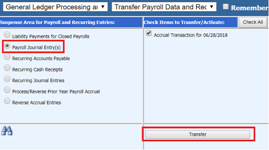Transfer All Closed June Payroll Dates to the General Ledger. To make sure the last payroll has been posted to the general ledger, go to “General Ledger Processing and Entry Options” and then “Transfer Payroll Data and Recurring Entries.” Select the “Payroll Journal Entry(s)” bullet. Then select the Transactions that have not been posted and select “Transfer.”