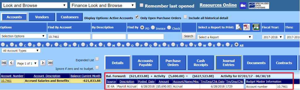 Reviewing how the Payroll Accrual Transactions posts to the General Ledger. Once the payroll accrual has been posted, you can view it in the Look and Browse area. Go to the menu option of “Look and Browse” and select “Finance Look and Browse.” This transaction will post with an “XA” journal source for the Accrual journal entry.