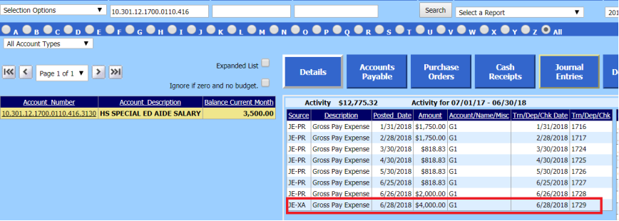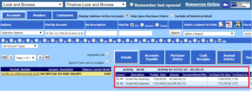 5. What do the Salary Accounts and/or Benefit Accounts look like after the first payroll and reversal of the payroll accrual? Below is an example of what the salary account postings will be like after the first payroll is processed and the reversal has been posted. For the account below, the payroll for the first payroll was $2000 and the reversal was $2000. This nets this account to zero as the expense for this payroll was posted into the prior fiscal year.