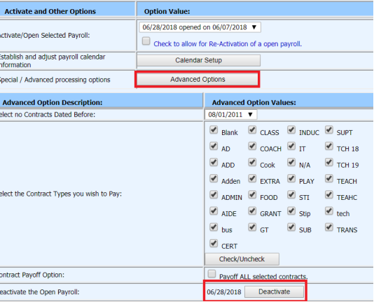 To finish the payroll accrual process, the date for this payroll must be deactivated. To deactivate the date, go to “Payroll Processing” and then “Activate/Open a Payroll.” Select the “Advanced Options” button. Once the screen opens for you, select the “Deactivate” button for the Payroll Accrual Payroll date.