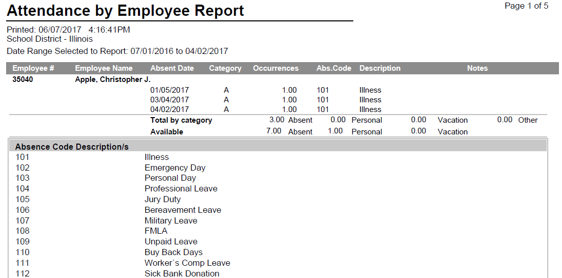 Attendance Report by Employee. This report shows each day the employee was absent during the time frame that is selected on the calendar’s for each of the attendance codes.