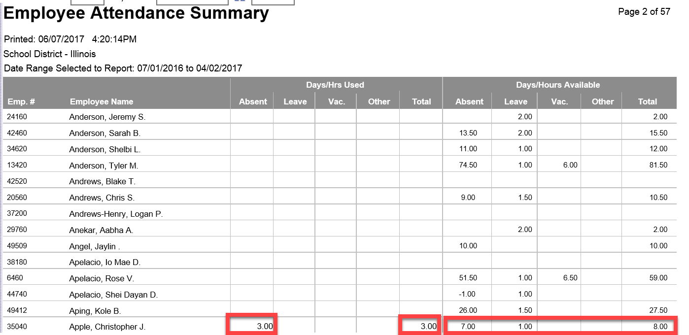 Employee Attendance Summary. This report shows, based on the date range selected on the calendar, how many days were used in each category of absent days and the amount of days that are remaining.
