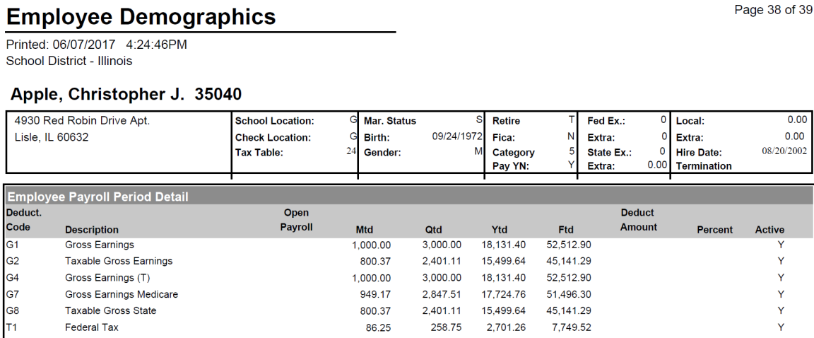 Employee Demographic Report. This report gives an overview of information on an employee. From the gross pay amounts, to the amounts for deductions and benefits, as well as all the individual payrolls based on the calendar date range that was used to produce the report. It also shows the contract amounts and the direct deposit information for the employee.