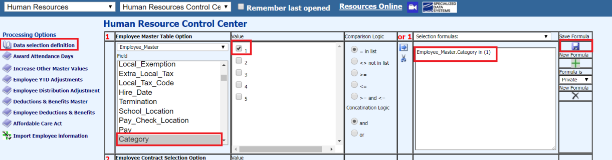 Update the “Category” field for the employees. For this example the following have been used to setup the various groups.