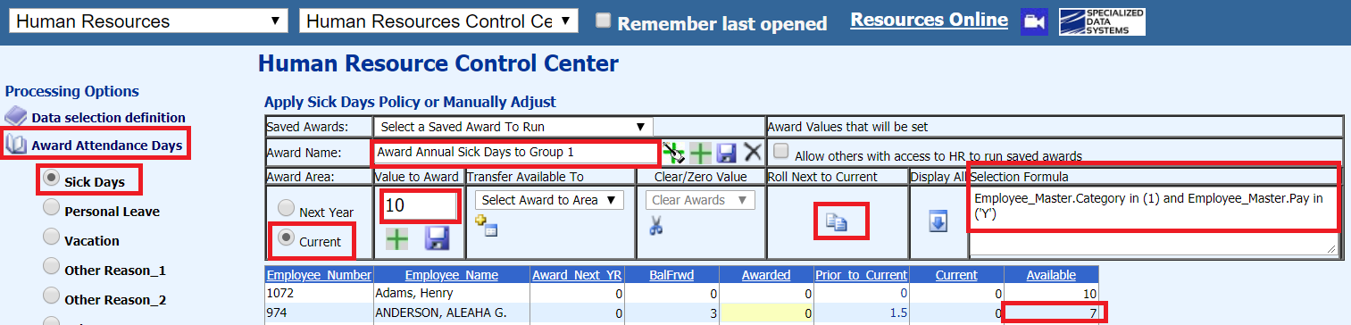 Screen 1: Note that the available Days are 7. These days need to move to Balance Forward as we award 10 new days for the new payroll fiscal year. We can also setup an “Awarding Name”. This award name can be used the next year for this group to assign the new days. I put “Award Annual Sick Day to Group 1” as the name for this group of employees. To move these days, select the option to “Roll Next to Current”. This option will move the days from Available to Balance Forward and award the 10 new days.