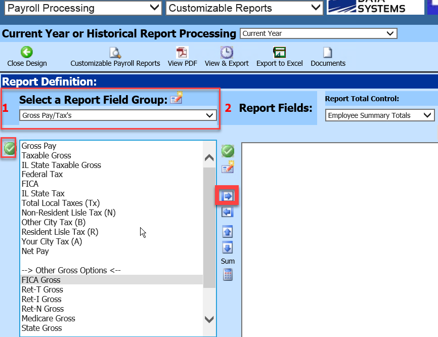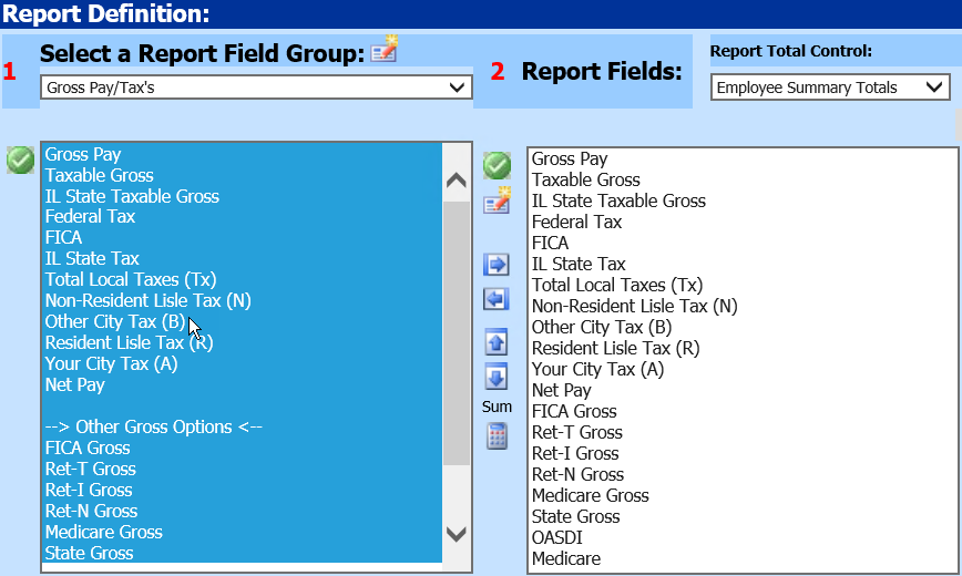 An example of a report would be to look at all the gross codes for the fiscal year. To do this, move all the gross codes from the first selection area over to the second area on this view. Do this by selecting the green check button and then using the arrow button to move them across the screen.