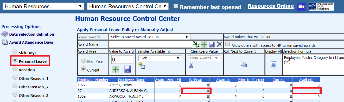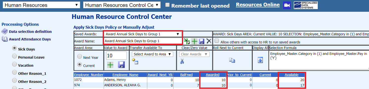 Awarding Days by Award Name and Group Selection, awarding days for the new fiscal year and moving the available days to the Balance Forward field.