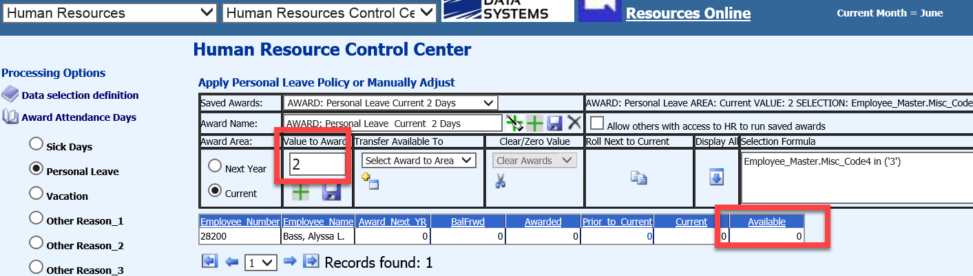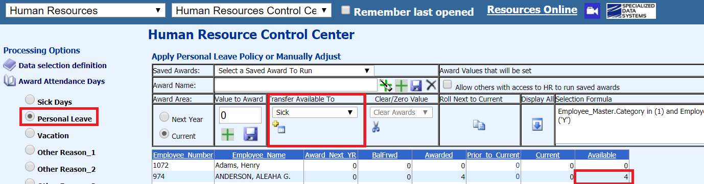 This process is designed to allow you to move days from the “Available field’ to the “Award Value” field, from one type of attendance to another.