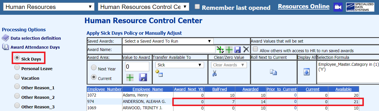 Screen 3: In the sick leave day’s attendance category, the awarded days went from 10 days, which was what were originally awarded in the above example, to 14 and the available days went from 17 to 21.