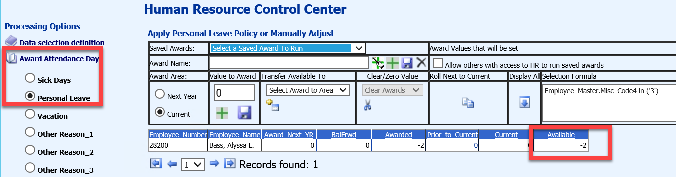 Screen 1: In this screen the employee has a negative amount in the “Personal Leave Available days.