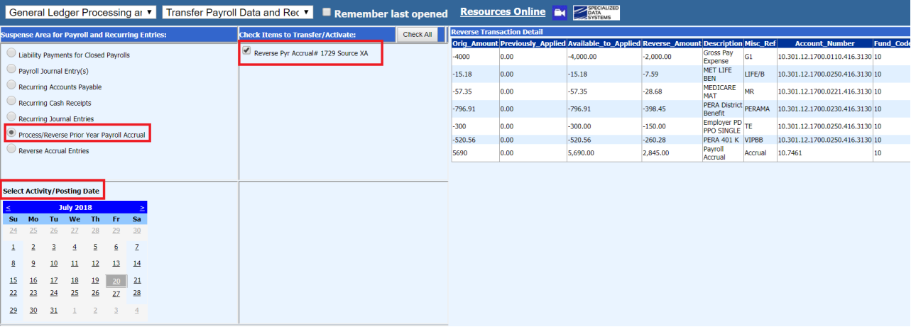 Transfer the “Payroll Journal Entry” in the “Transfer Payroll Data and Recurring Entries”. After all reports have been verified, the next step is to post the transactions. Proceed to “General Ledger Processing and Entry Options” and select “Transfer Payroll Data and Recurring Entries.” Select the bullet “Payroll Journal Entry(s).” Select the Accrual Transaction and then select the “Transfer” button. This will transfer the Payroll Accrual Transaction to the General Ledger.