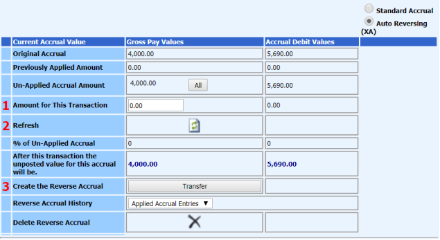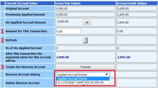 What happens during the “Transfer” option? The system will reverse out the portion of the original accrual that was entered into the number 1 “Amount for This Transaction. It will then keep track of the amount that is remaining to reverse. Therefore, if only a portion of the accrual was reversed you must come back to this area after each payroll and reverse the remaining amount of the accrual. If for some reason, you need to delete the reversed accrual entry, you will be able to select the entry date in the Reverse Accrual History and select the delete option.