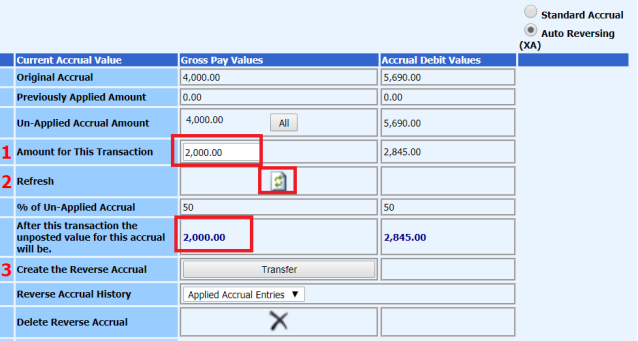 . The total amount of the accrual can be posted at one time or based on the number of payrolls the accrual was calculated for. You can divide the amount in the “Un-Applied Accrual Amount” by that number. In this example, I had “2” payrolls in the accrual payroll calculation. Therefore, I will reverse out $2,000. Enter in the amount of the reversal in the “Amount for This Transaction” field. Select “refresh.” Select “Transfer” after the system has refreshed.