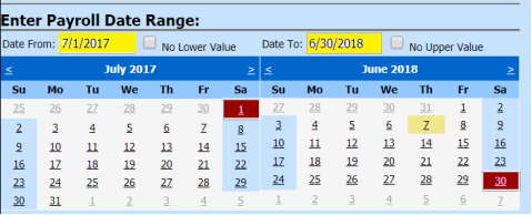 Screen 2: Select the dates on the calendar that are needed for the report. For the example I selected the Payroll fiscal year.