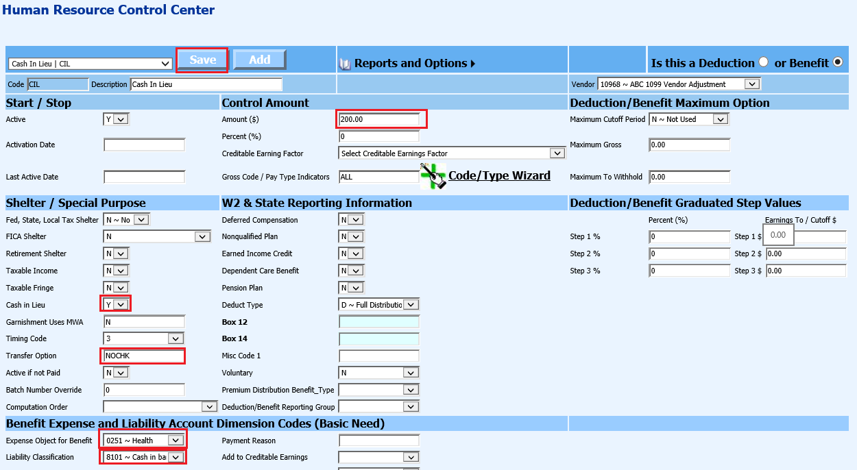 The cash in lieu of a fringe benefit option replaces the need to setup a secondary time card or contract for the cash in lieu of a fringe benefit.   This will apply the benefit, to be added, to the base Gross Pay.  Using this benefit setup, no payroll liability will be created and there will be a debit to the expense and credit to decrease cash included in the Payroll Transaction that is created by the system.