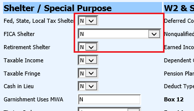 14. Other fields that need to be looked at closely are “Tax Shelter YN”, “FICA Shelter YN”, and “Retirement Shelter YN”. If the cash in lieu should increase the Taxable gross, FICA gross or Retirement gross then a “T” must be entered into these fields. (consult your auditor if you have any questions about this)