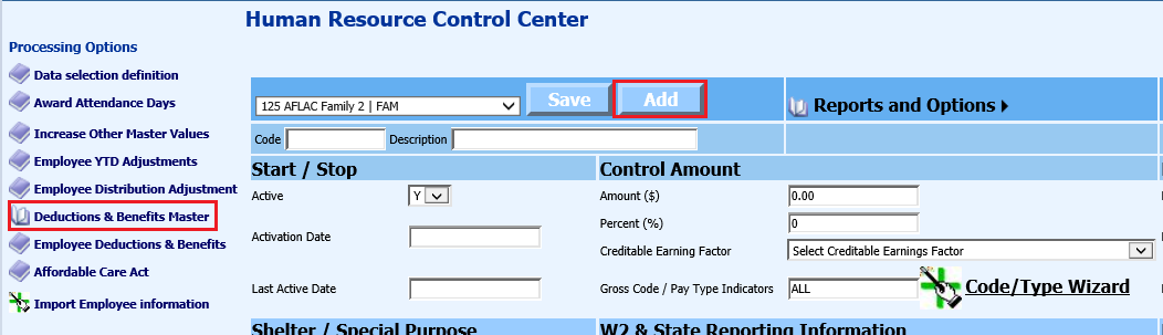 Enter in the needed information for new code. See below link for additional detail on Deduction and Benefit Master setup: http://help.schooloffice.com/FinanceHelp/#!Documents/humanresourcescontrolcenterdeductionsbenefitsmaster1.htm