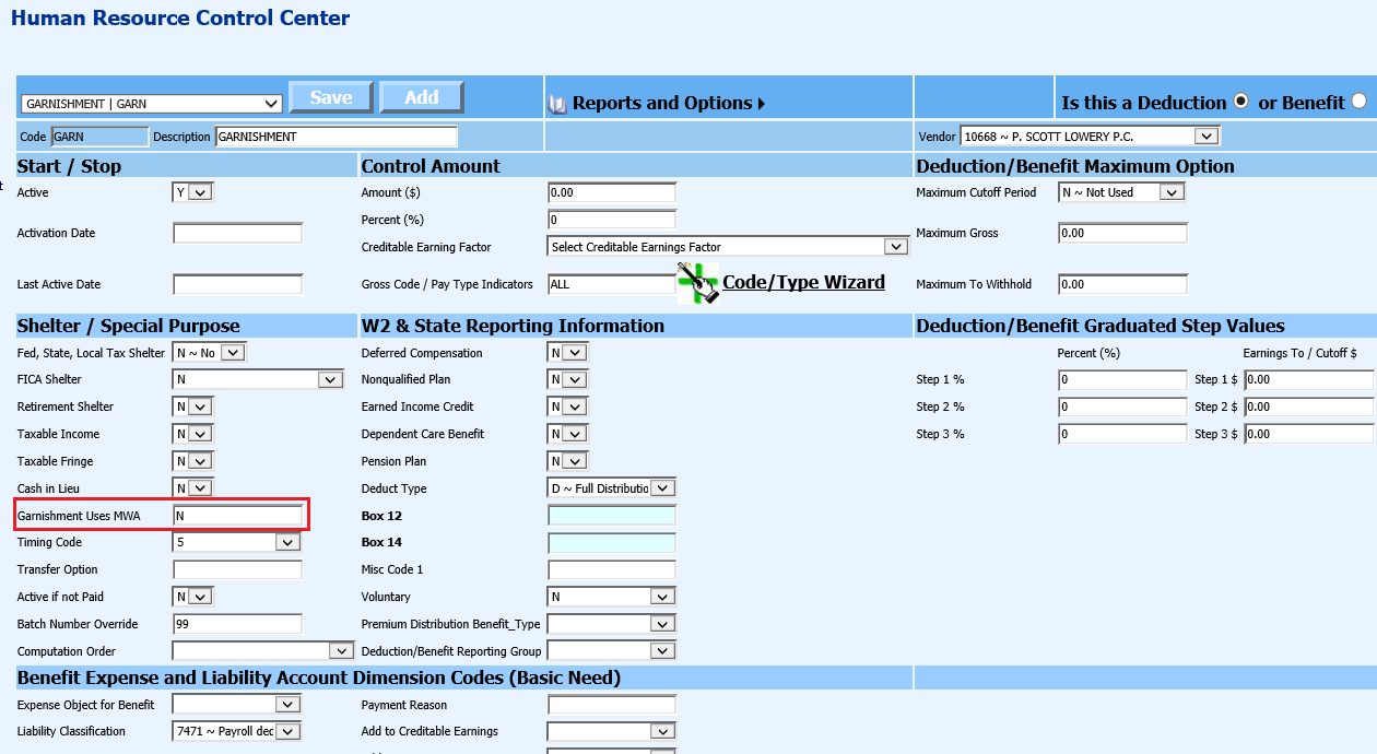 With the garnishment process using the Minimum Wage rules, other deduction records may need to be updated and coded in the field “Garnishment use MWA”. This fields is also used to identify the needed information for proper payroll computation.