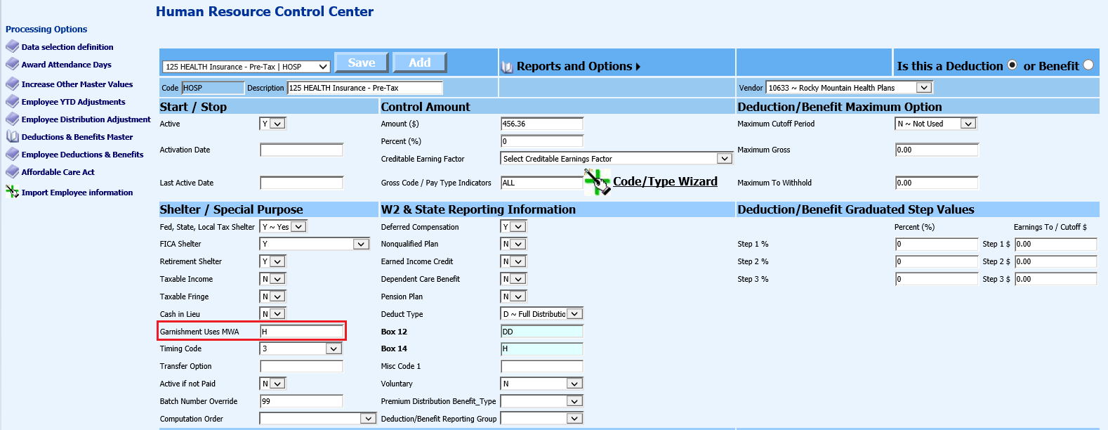 There are a three different methods of setting up an employee garnishment: Through Human Resources Control Center, Add, Change Employee Information, and within the Employee Demographics Vertical Entry View.