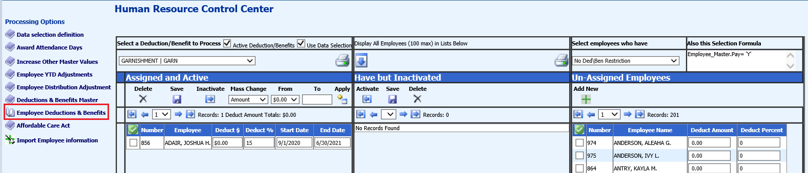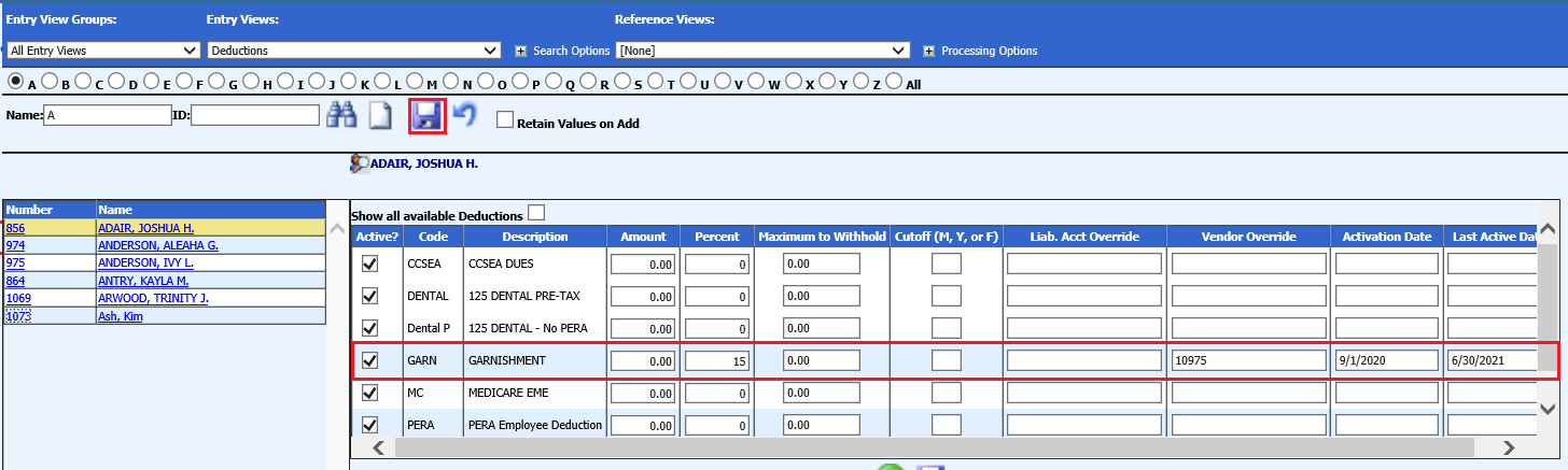 Select the employee and assign the garnishment code.