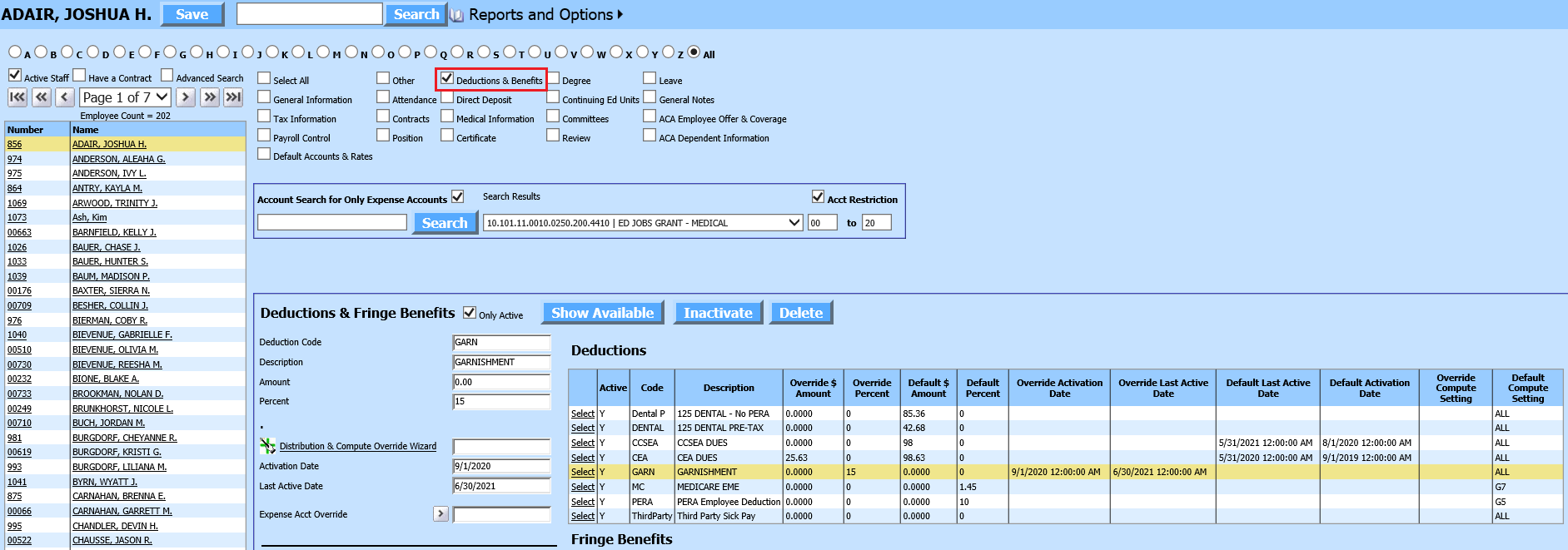 Select Employee, Contracts, Deductions/Benefits, etc.