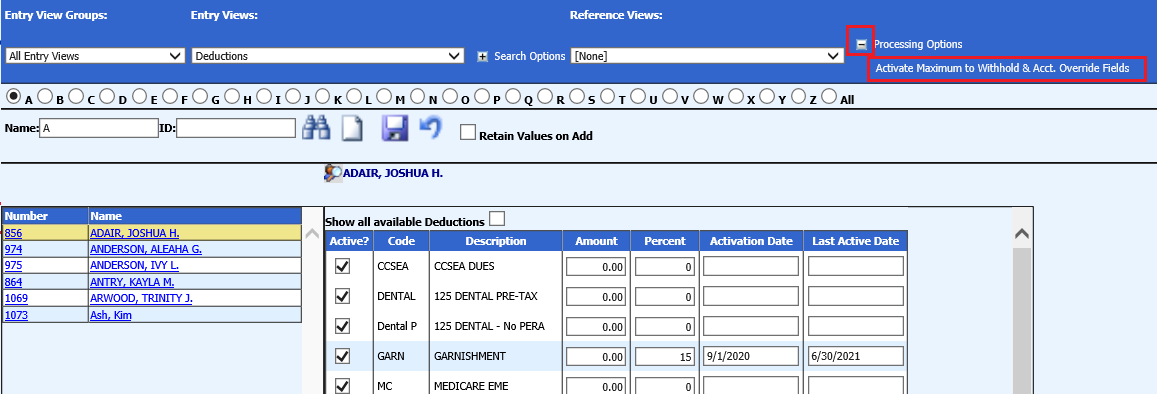 Select Activate Maximum to Withhold & Acct. Override Fields