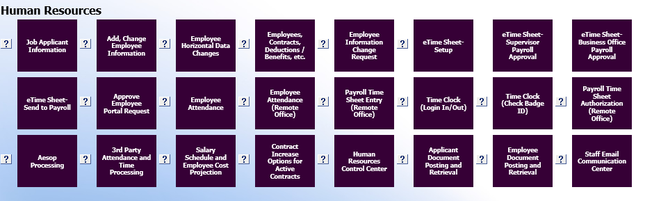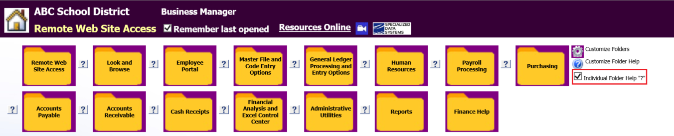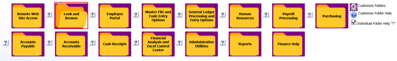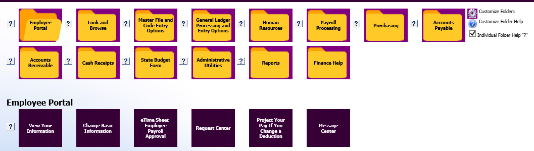 The Question Mark Icon to the left of each Folder or Program Option is a quick reference link to the Finance Help Documentation for that particular area.