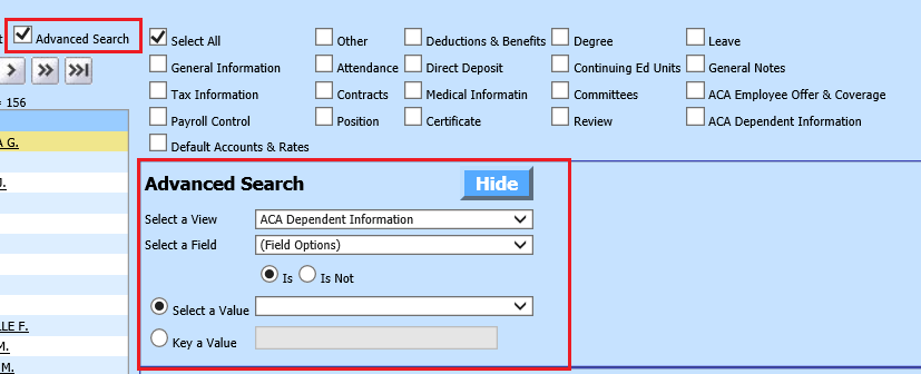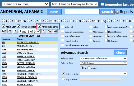 Using the Advanced Search, you can search out using an Employee entry view, Specific field, and a Value you are searching for.