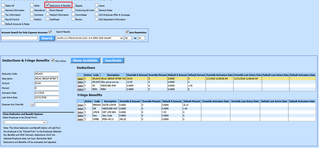 In this entry view you can assign, inactivate, and change employee Deductions and Benefits records. If you enter any overrides in this area, it will override what is listed the Master record and use this amount for the employee’s pay.