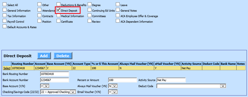 The Direct Deposit view is for entering the Employee banking information for Payroll Processing.
