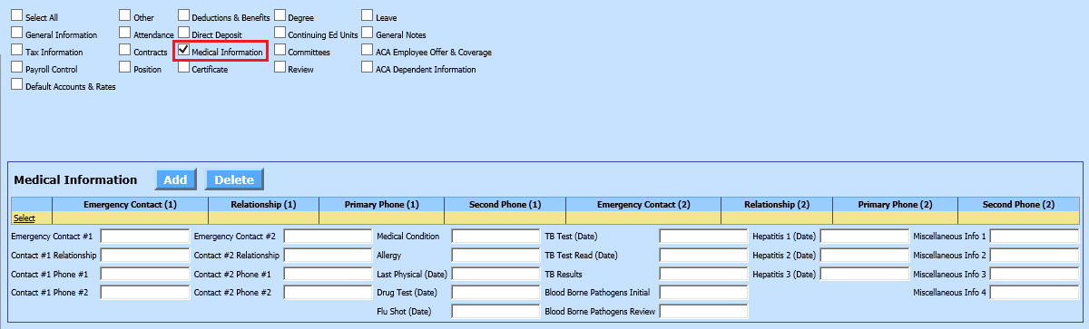 The Medical information option contains the Emergency Contact and Health Records for the employee.