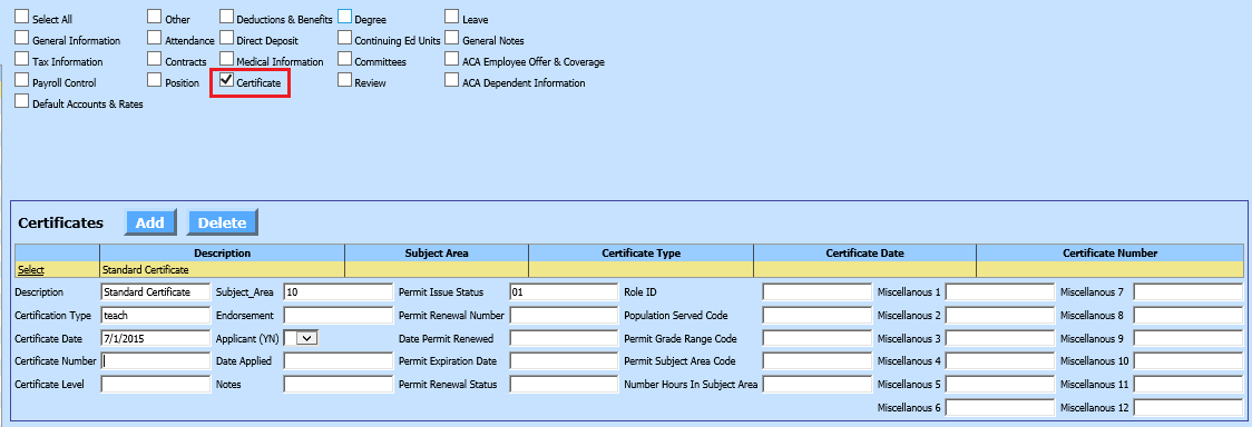The Certificates option allows you to track the Employee Certificates for employment records.