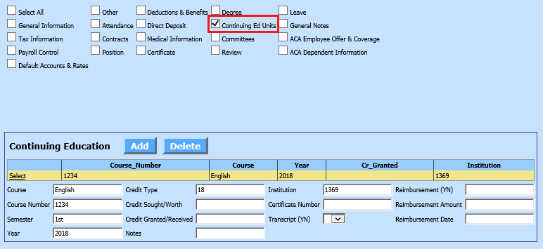 The Continuing Ed Units option allows you to track the Continuing Education courses for employees.