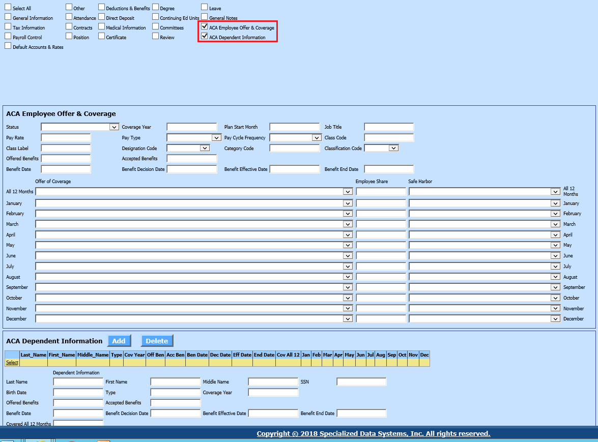 The two ACA data entry views contain the fields to be completed for the ACA reporting requirements.
