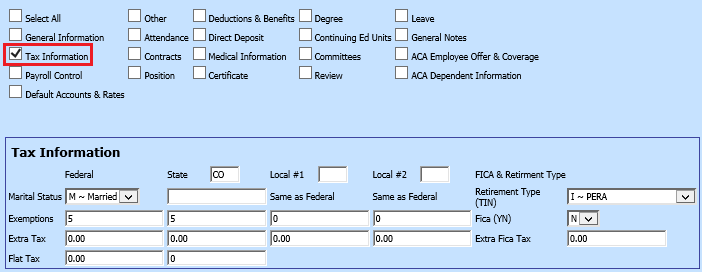 The Tax Information view shows the Employee’s tax information for payroll processing.