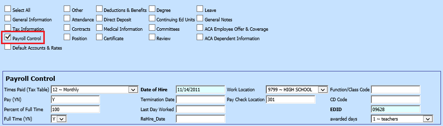 The Payroll Control option gives payroll information used for payroll and reporting requirements.